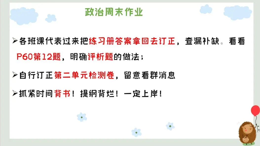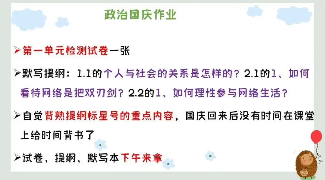 - 带知识提纲、书本、练习册回去复习,练习册主要看错题,把知识提纲最后的“错别字集训”做了,也会发答案下去